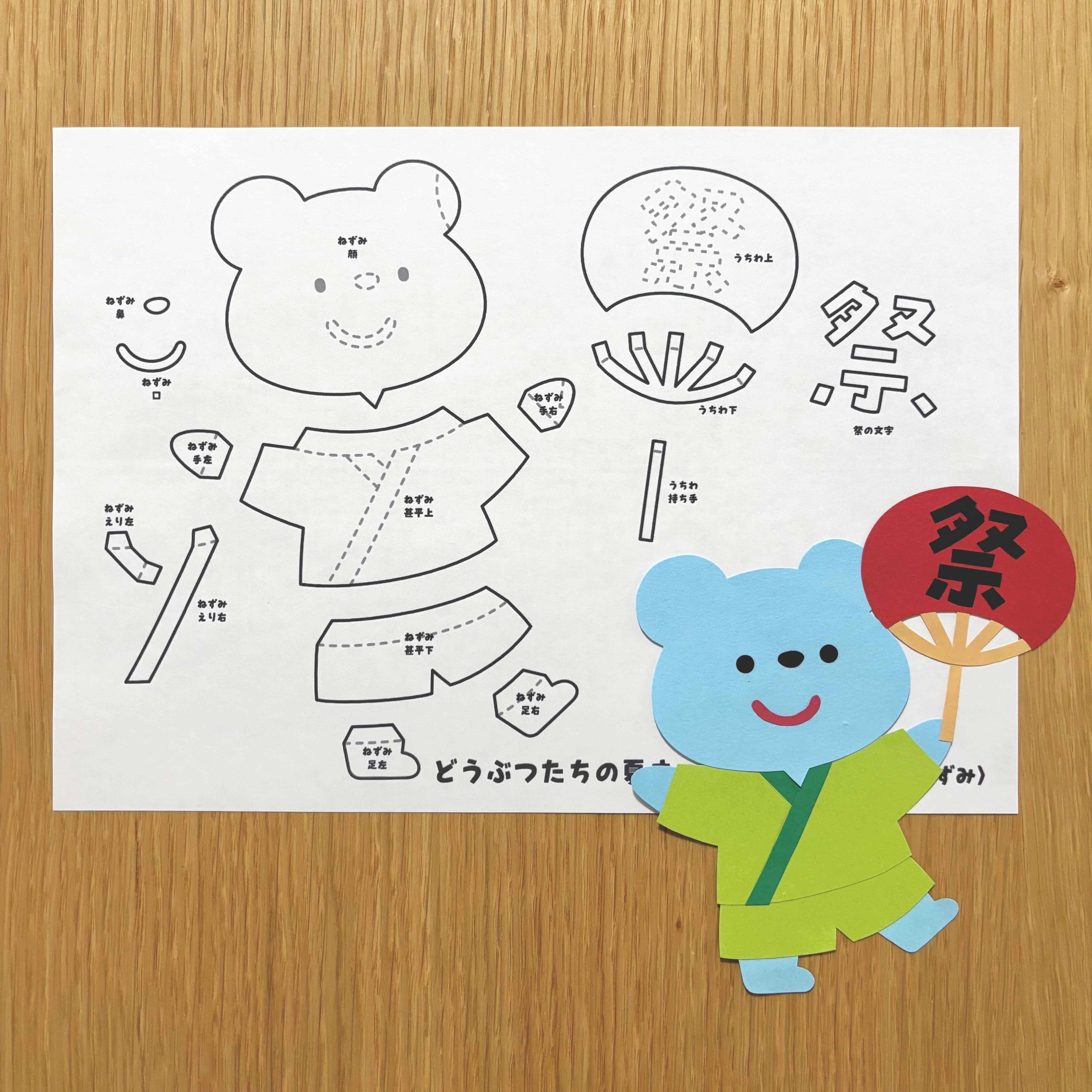 ほいくえのホームページより無料ダウンロードできる、『どうぶつたちの夏まつり壁面型紙』の追加素材です。