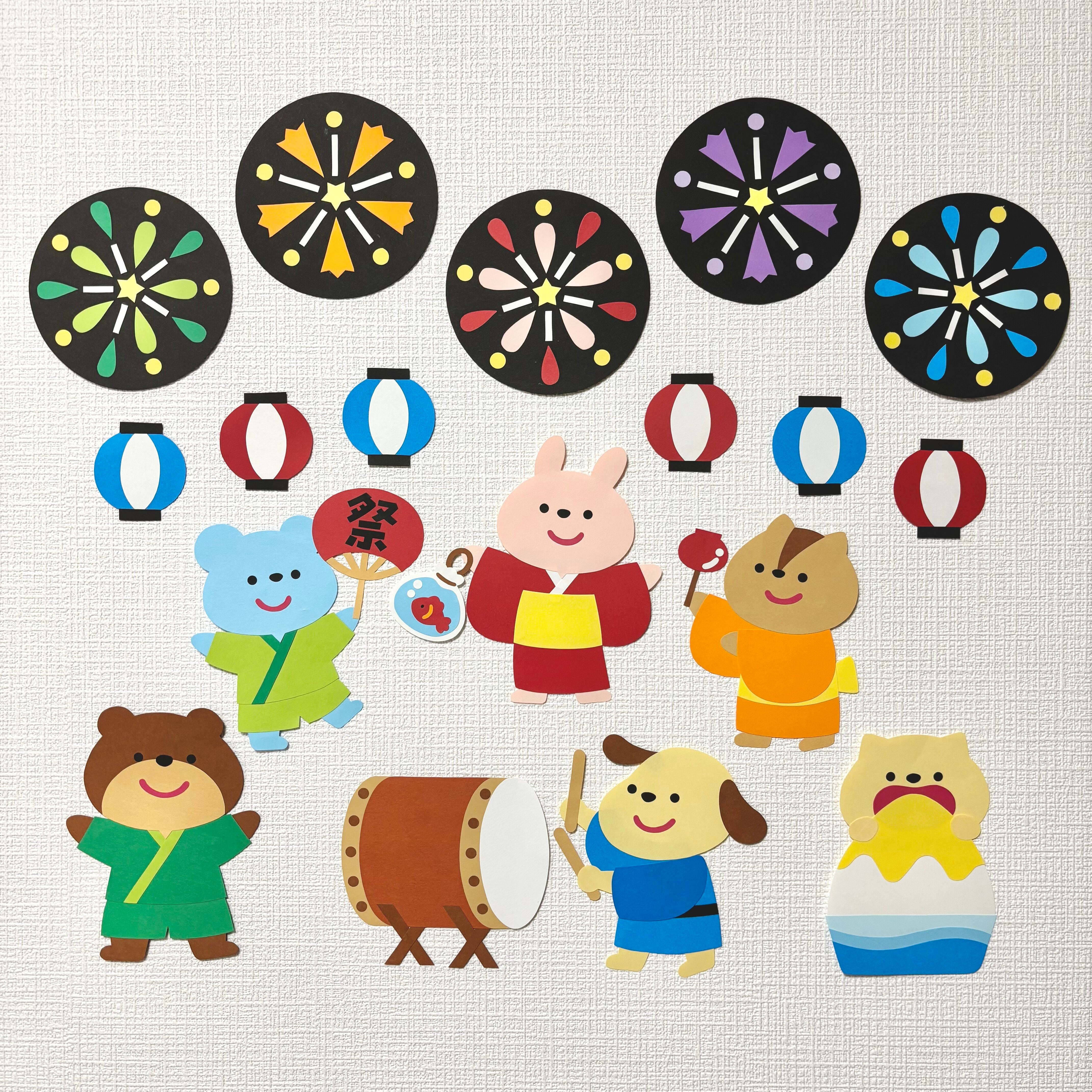 ご購入いただき、無料の型紙素材と合わせて製作していただくと、かき氷を食べるねこ、うちわを持って踊るねずみ、りんごあめを持ったりす、花火が追加されて、よりにぎやかで楽しい壁面になります!