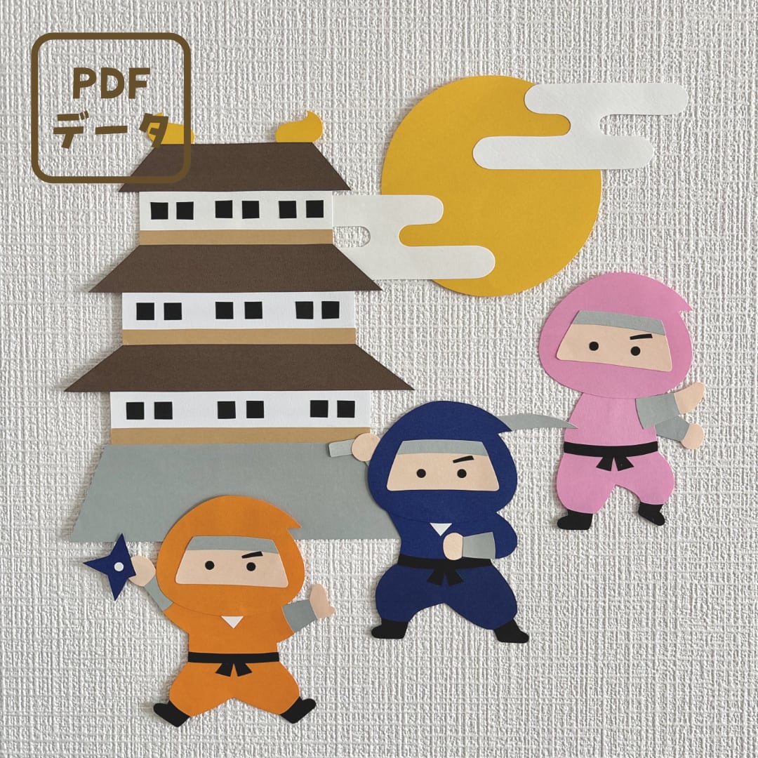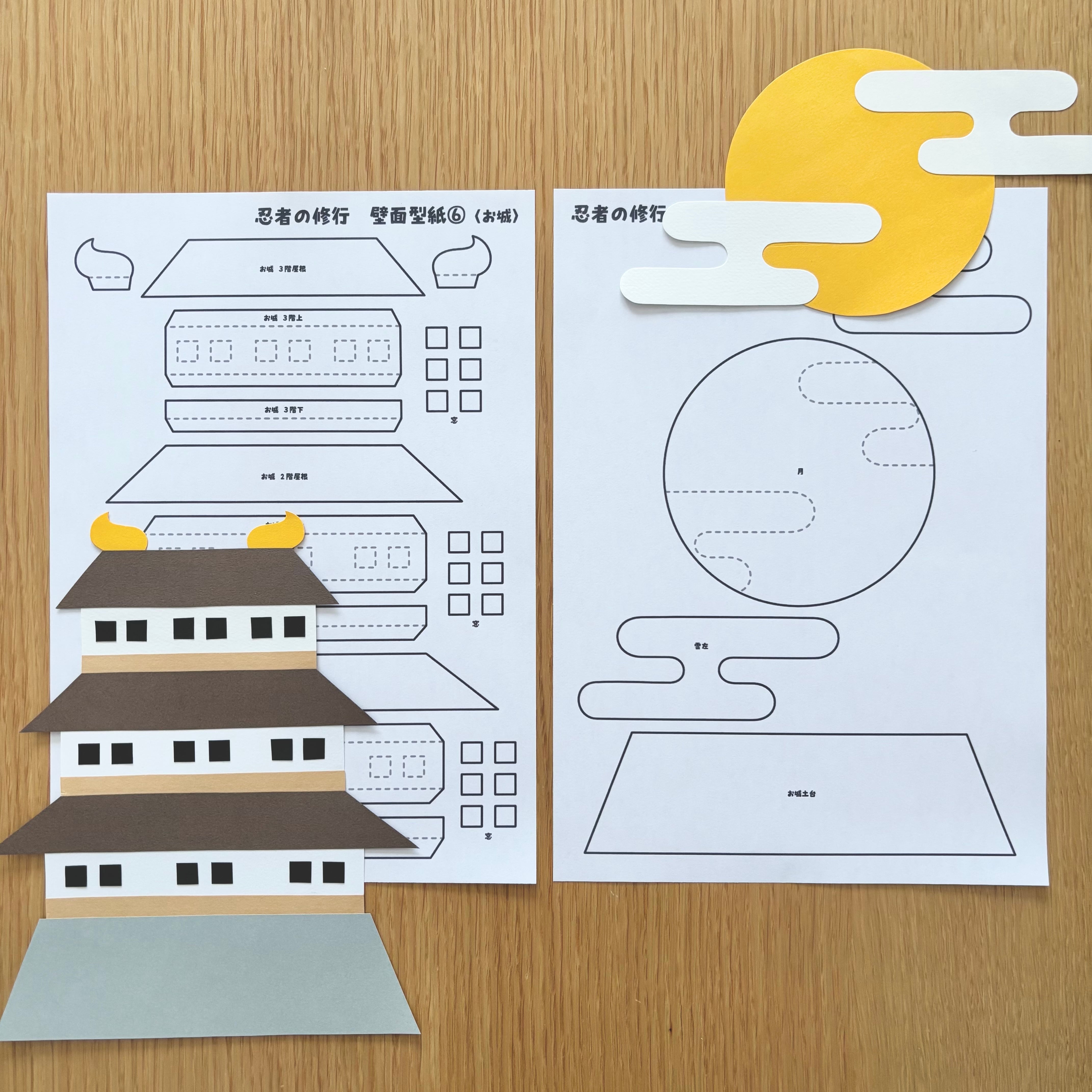 ご購入いただき、無料の型紙素材と合わせて製作していただくと、さらに3人の新しいポーズの忍者たちと、お城と月が追加されて、よりにぎやかで楽しい壁面になります!