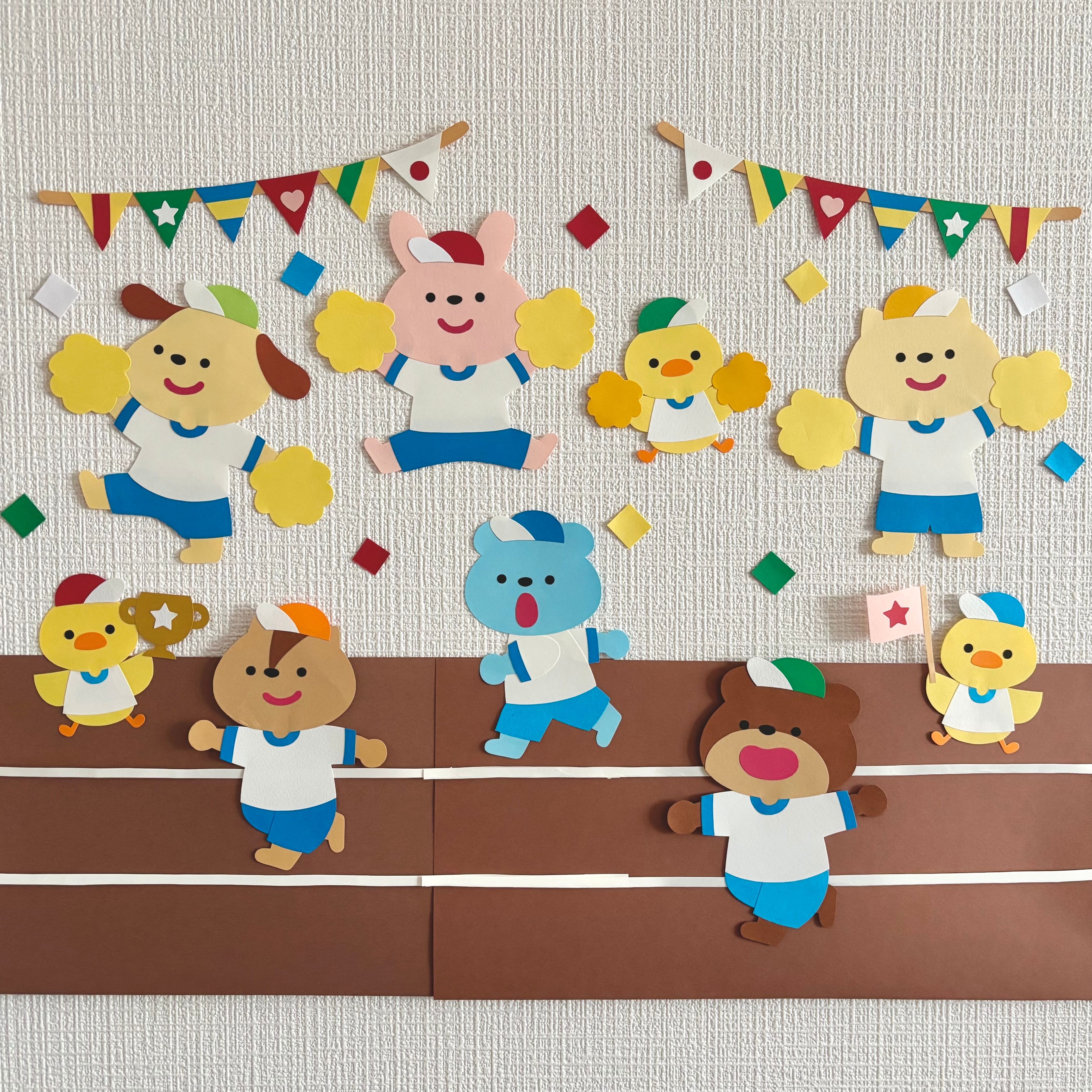 ご購入いただき、無料の型紙素材と合わせて製作していただくと、さらに走っているどうぶつたちなどの壁面が追加されて、よりにぎやかで楽しい壁面になります!