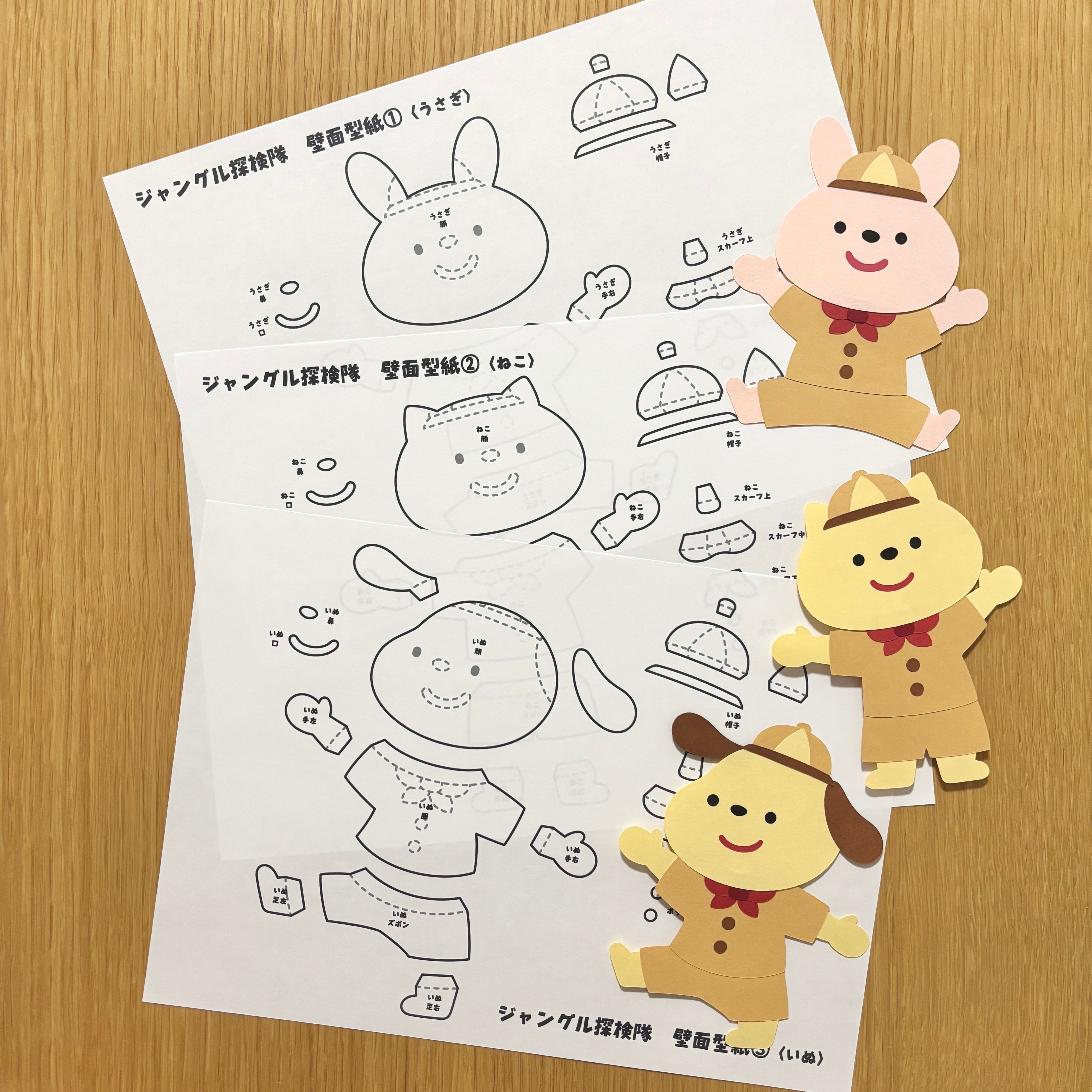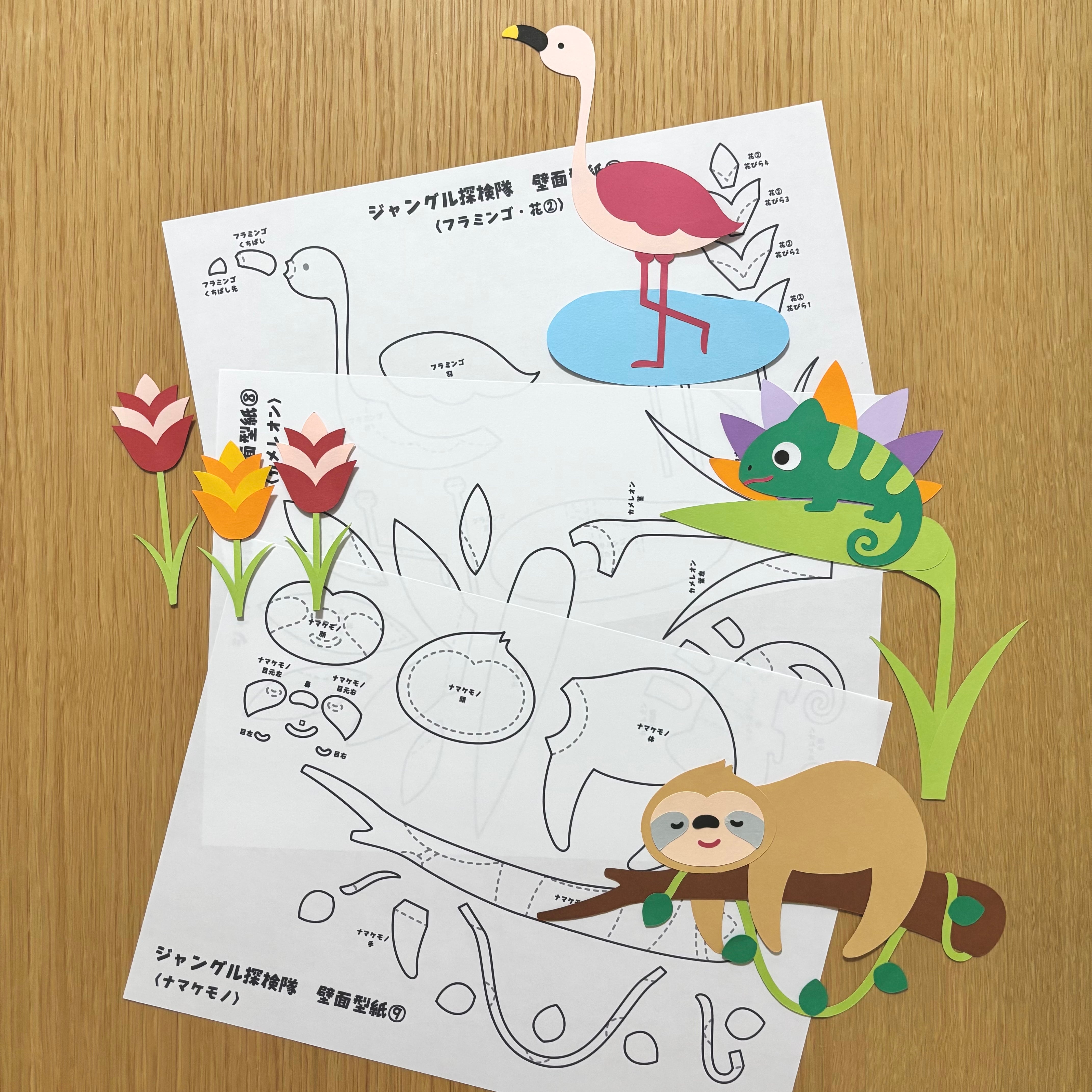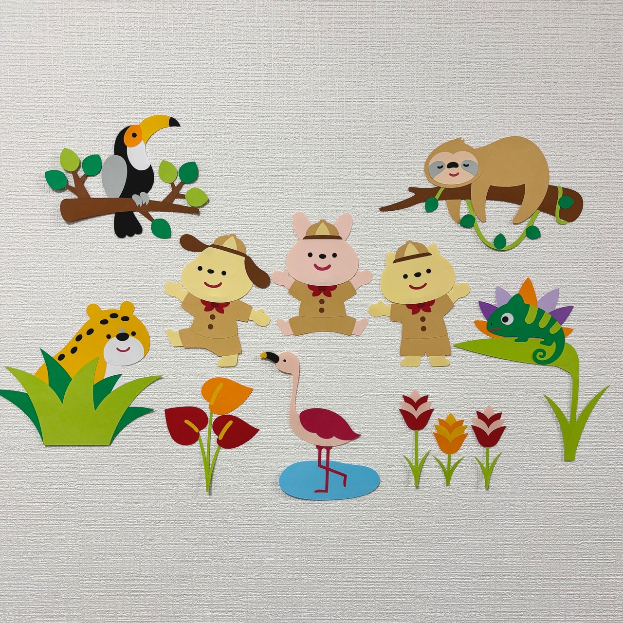子どもたちが親しみやすい、探検隊になったどうぶつたちとジャングルにいる生き物たちの壁面型紙です。