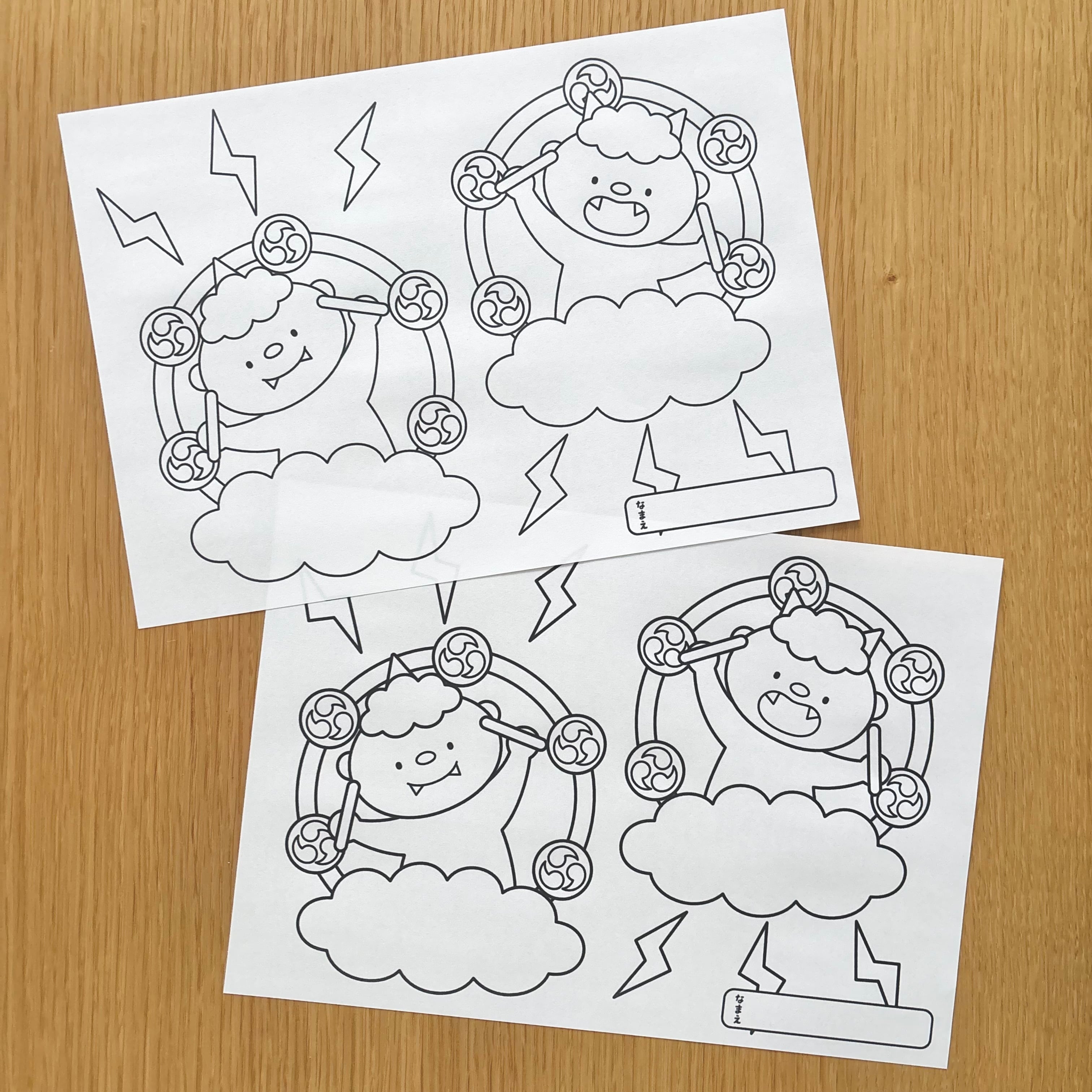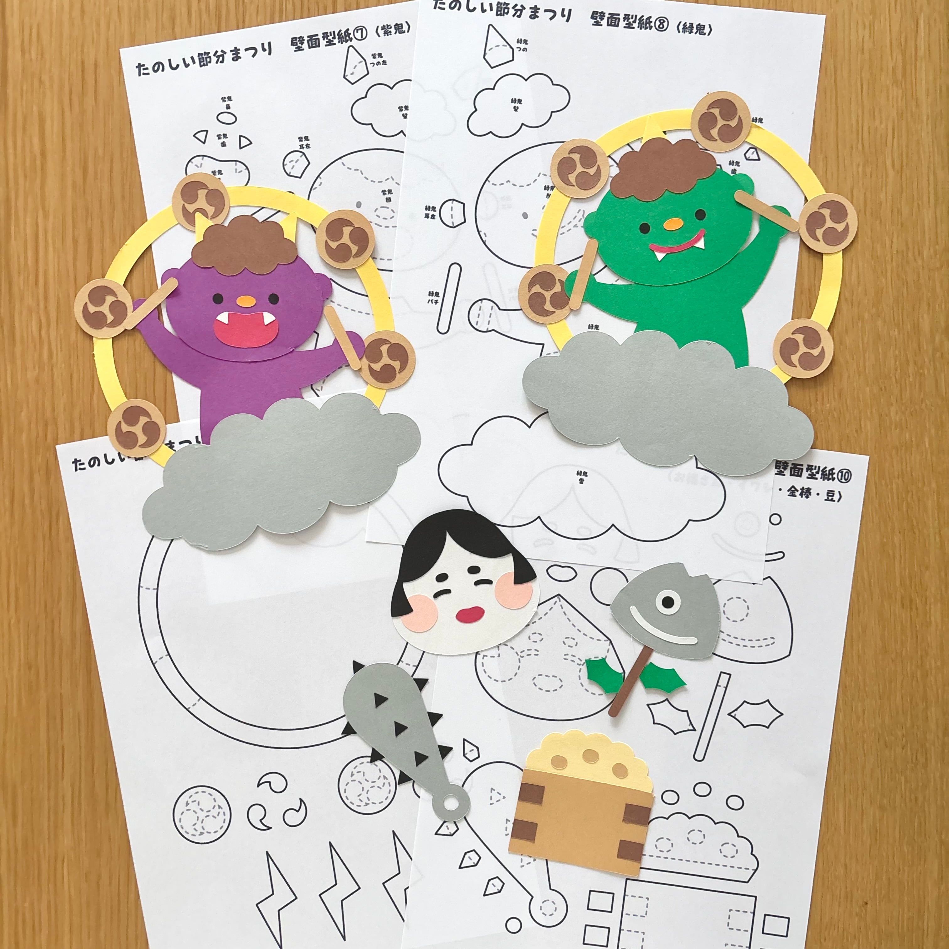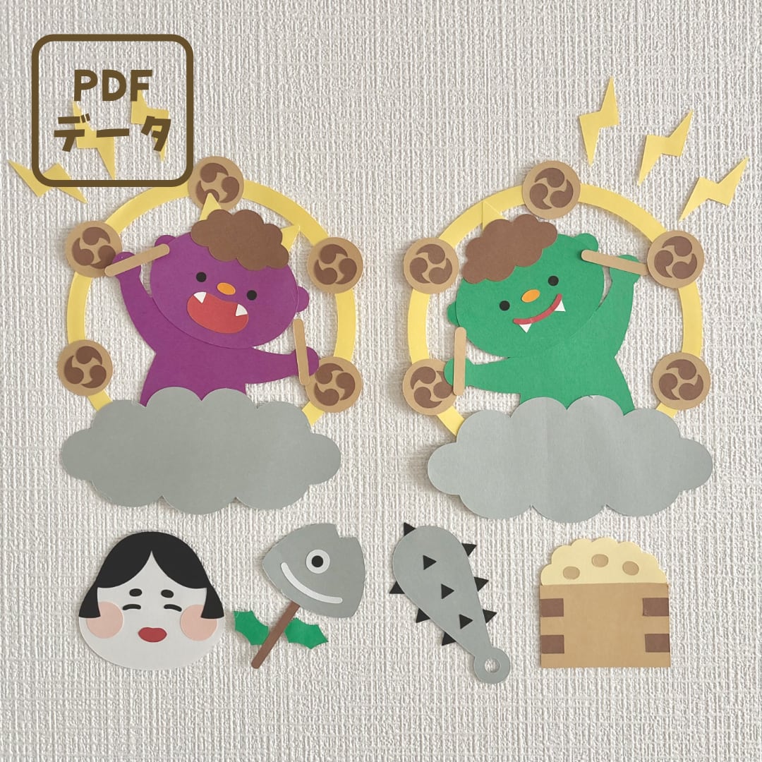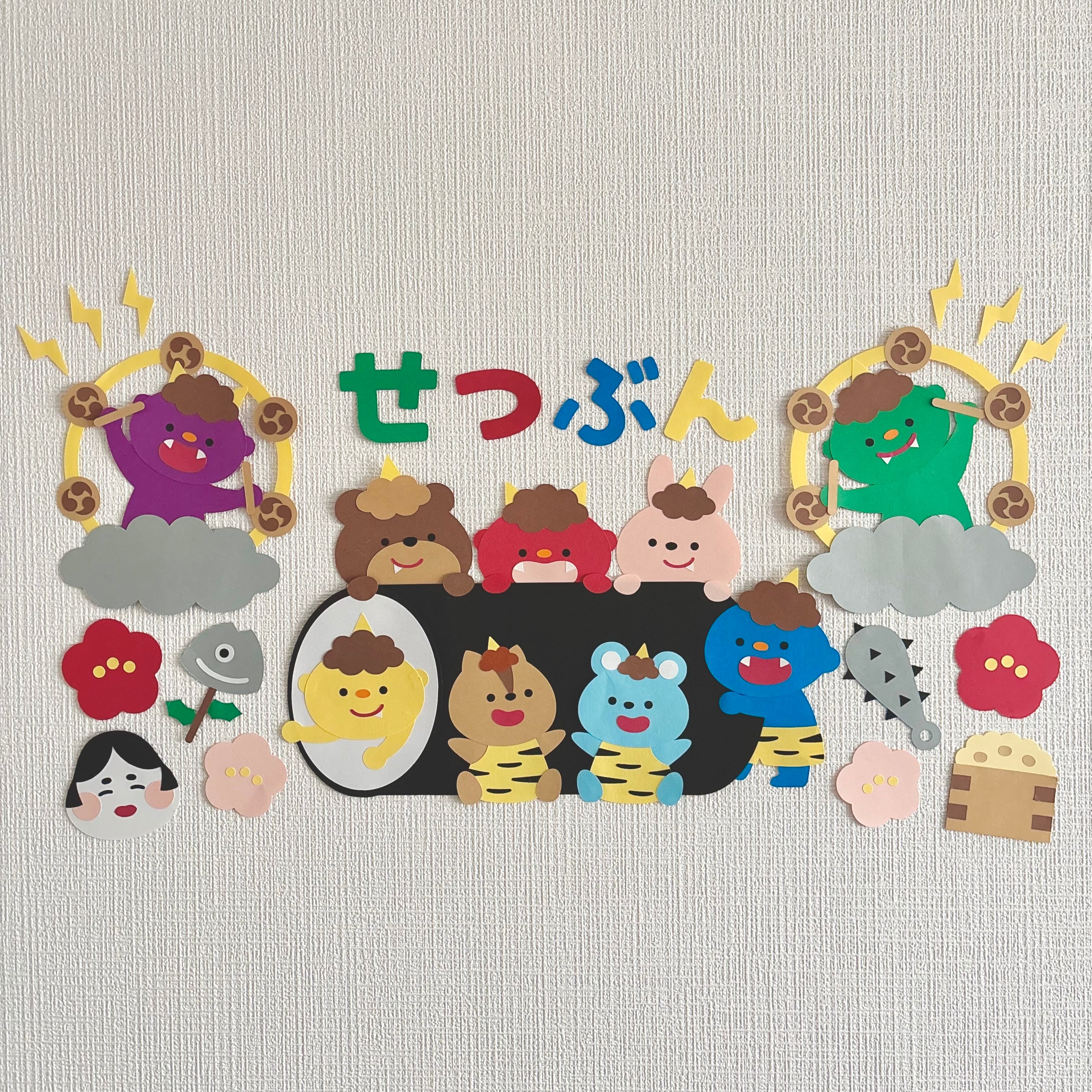 ご購入いただき、無料の型紙素材と合わせて製作していただくと、雷様になった2匹の鬼や、お福さん、いわし、豆、金棒の壁面が追加されて、よりにぎやかで楽しい壁面になります!