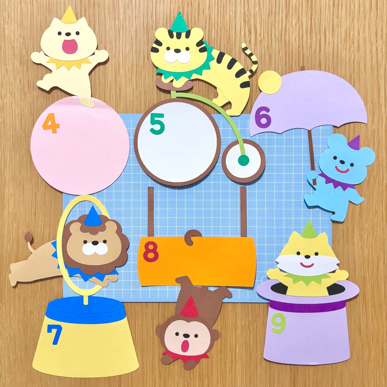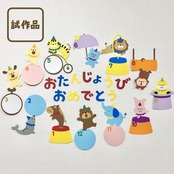 ほいくえのホームページより無料ダウンロードできる、『おたんじょうび表(サーカス)壁面型紙』で製作した壁面の試作品です。