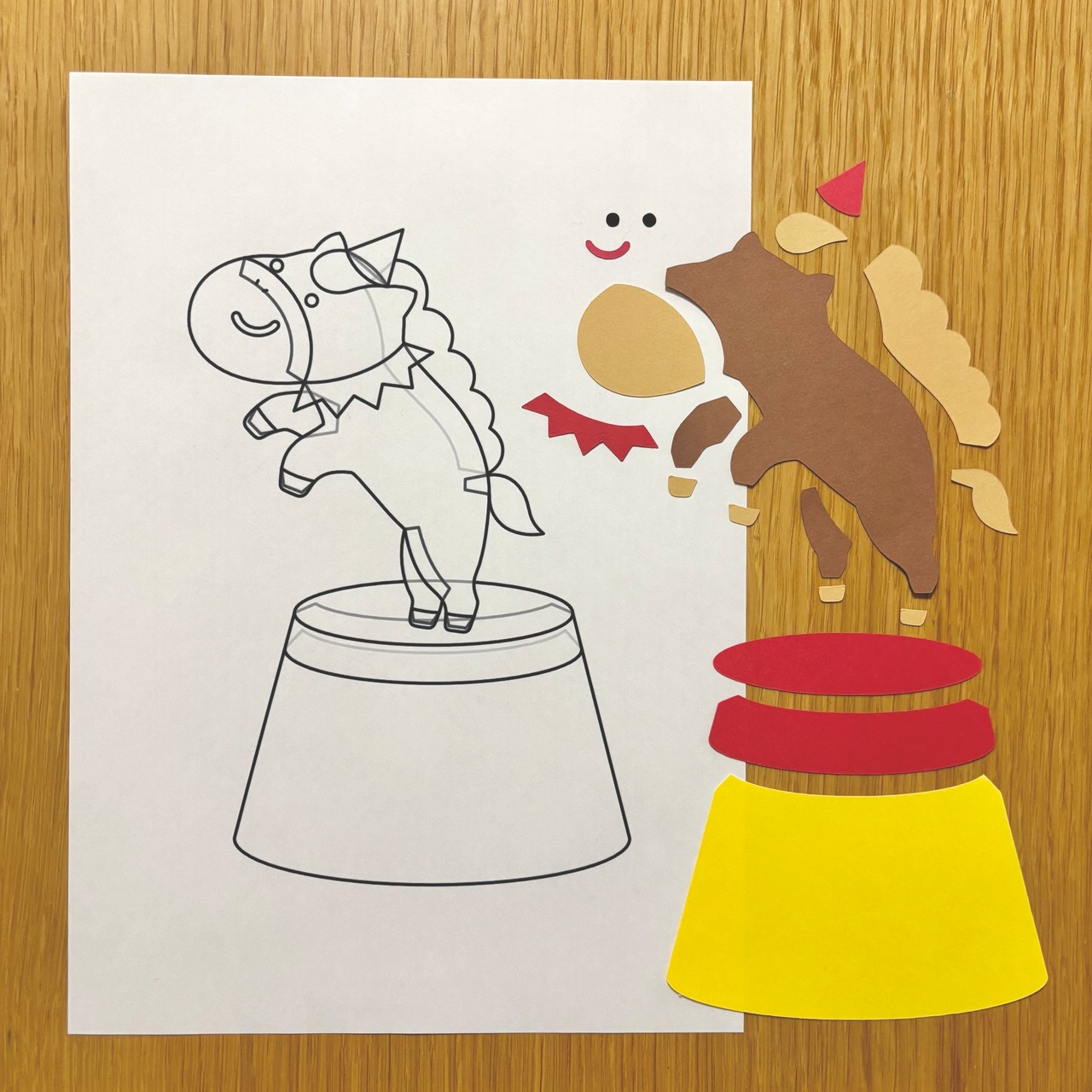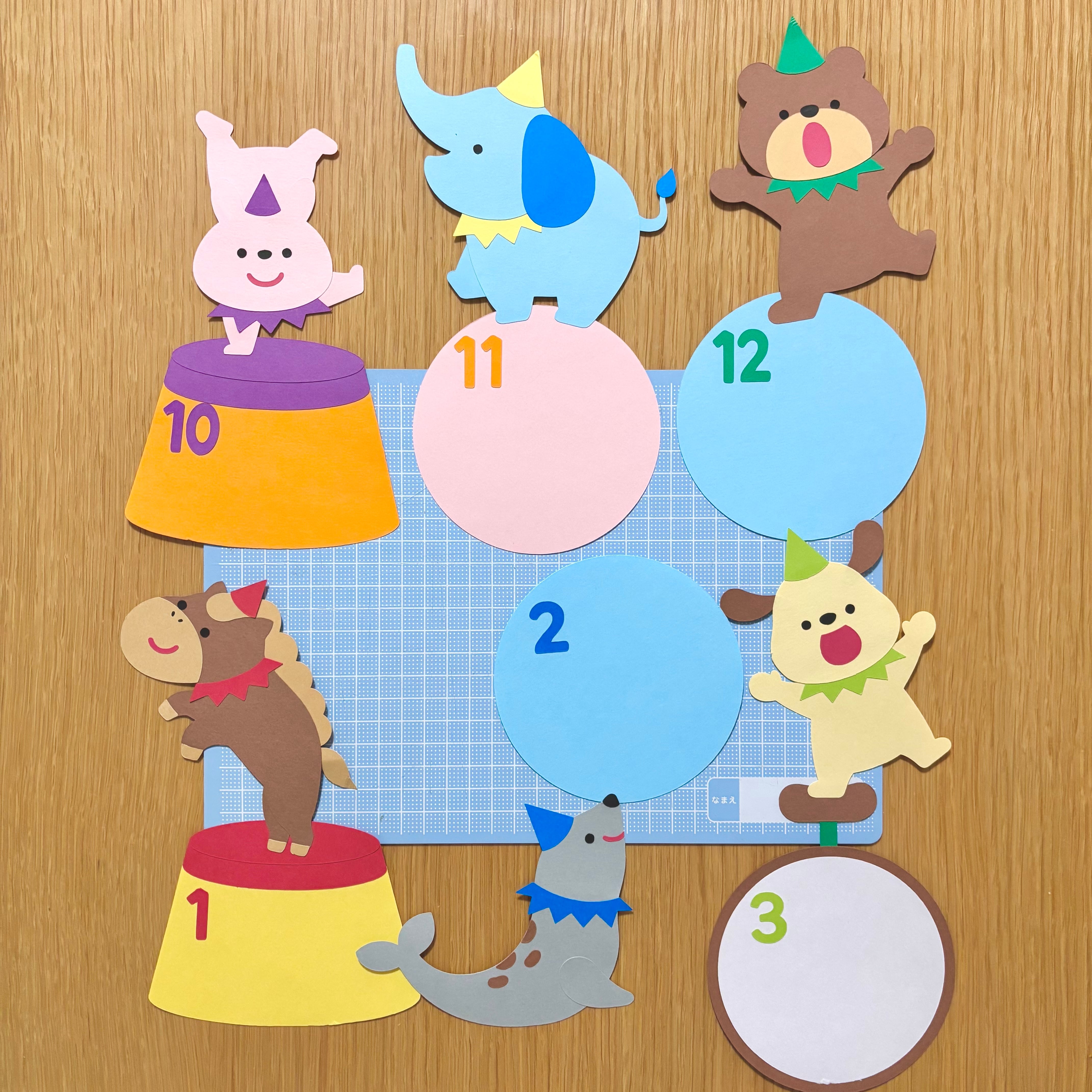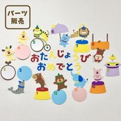 ほいくえのホームページより無料ダウンロードできる、『おたんじょうび表(サーカス)壁面型紙』で製作した壁面のパーツ販売です。